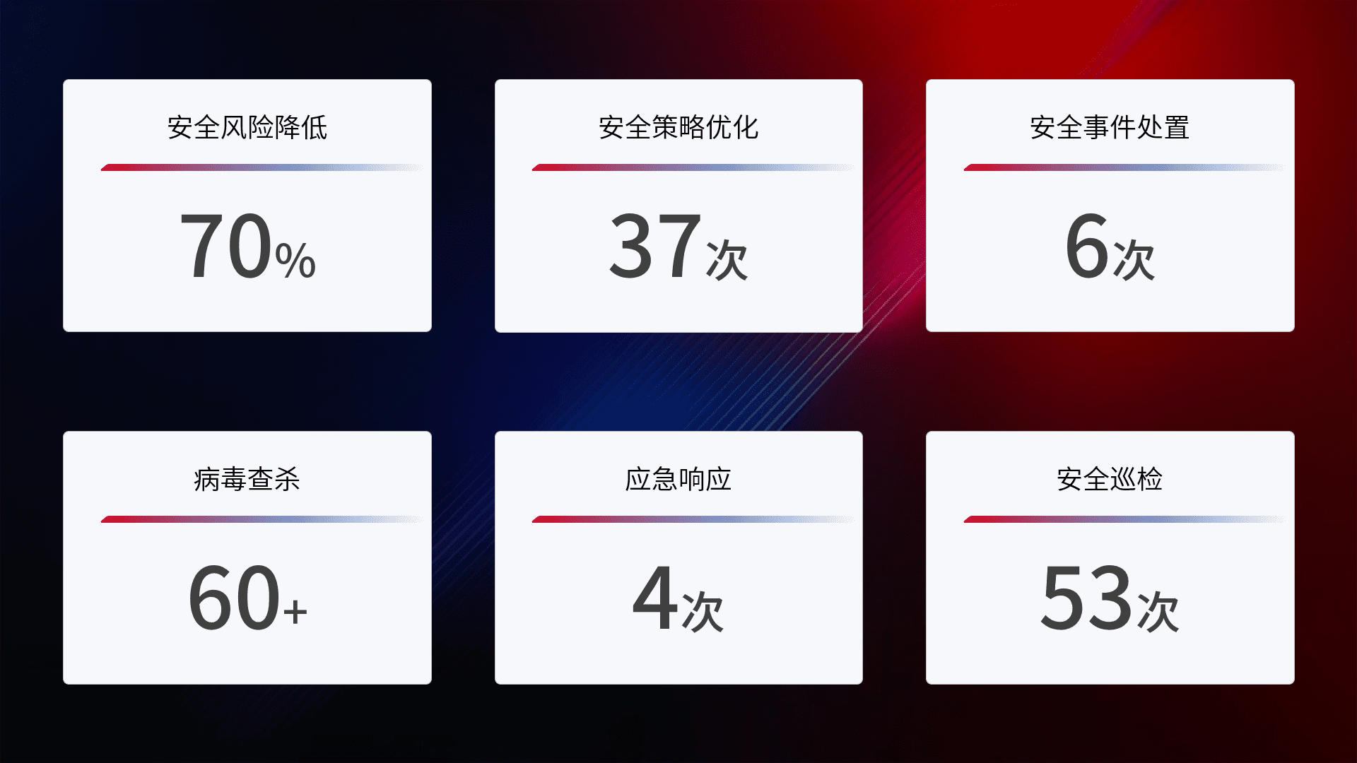 提供全面的安全事件报告体系,,,包括处置报告、、周报、、、、季度和年度总结,,结合持续监控,,,帮助客户深入了解网络安全状况。。。。