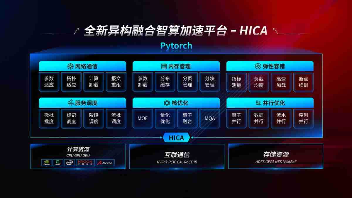 通过自研的服务层、、中间适配层、、、、以及调度编排算法,,,采用数据并行、、、、模型并行等多种并行方式,,把并行计算任务进行有效的分解,,,使其分别由相应的软件栈和算力资源来承接。。当GPU资源变化,,HICA可以实时动态调度计算子任务并调整模型拓扑和架构,,以充分聚合各种算力资源。。。。